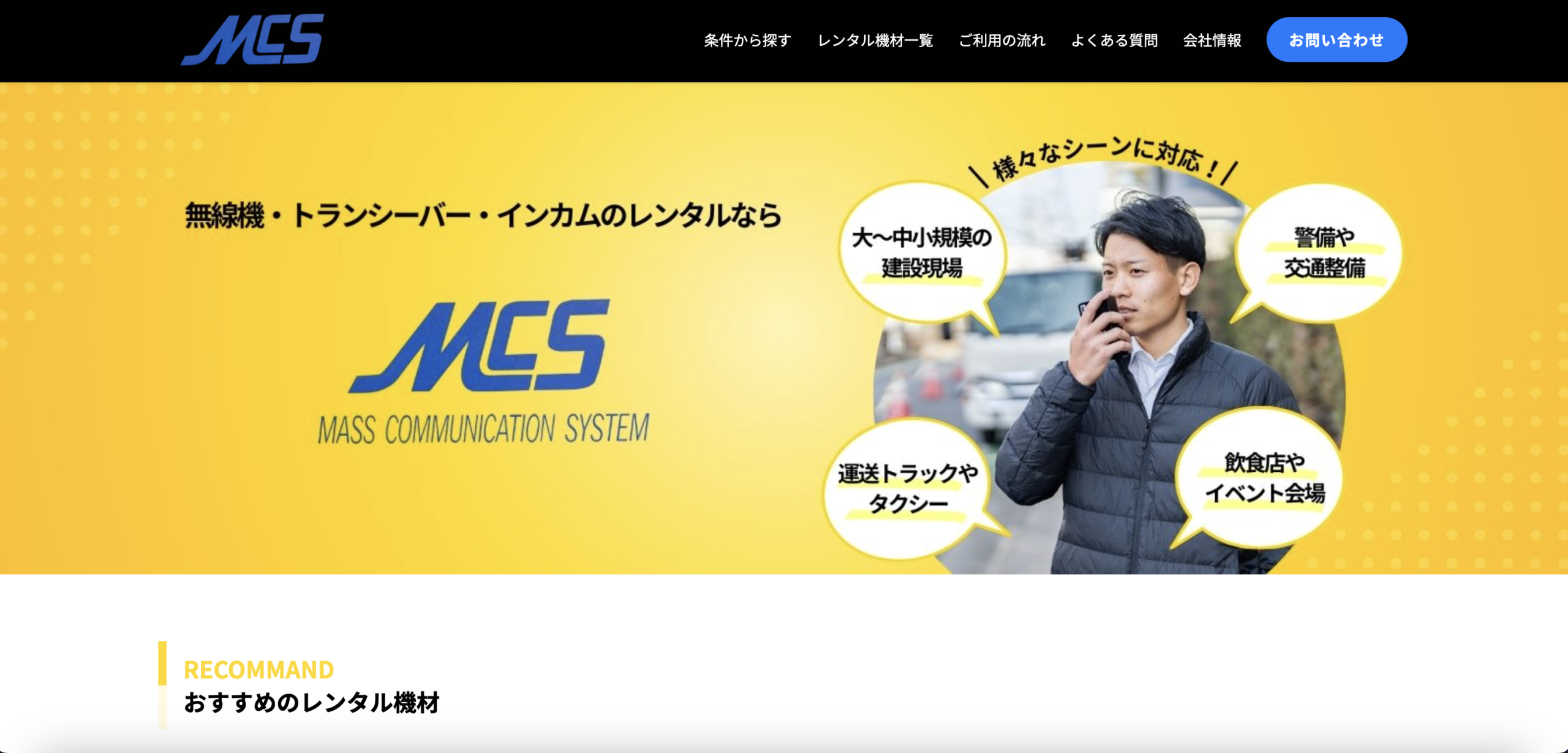 「株式会社マス・コミュニケーションシステム」は、無線機・トランシーバー・インカムのレンタル・販売・導入コンサルティングを通じて、建設現場、運送・タクシー、飲食店、イベント会場などさまざまなビジネスシーンにおける通信ニーズをサポートする企業です。